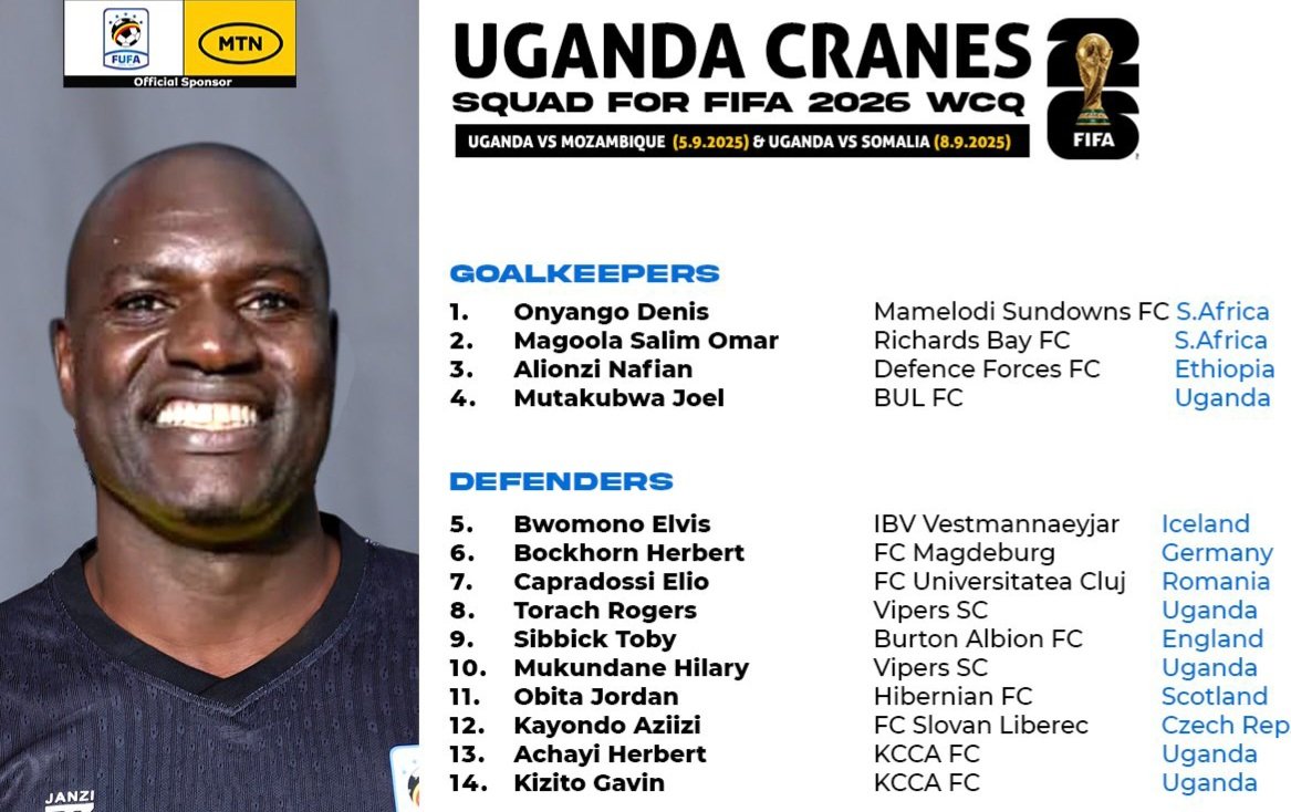 Dennis Onyango ng’omupiira ogw’ensimbi agucangira mu club ya Mamerodi Sundowns eya South Africa, yoomu ku bazannyi 28 abayitiddwa okwetegekera okuzannya ne Somali ne Mozambique mu mpaka za FIFA World Cup Qualifiers ez’omwaka 2026.