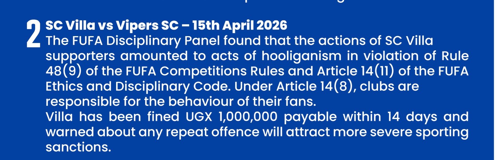 Ekibiina ekiddukanya omupiira mu Uganda ekya FUFA, kiragidde club ya Villa Jogo Ssalongo okusasula engassi ya nsimbi akakadde kamu, olw’ebikolwa ebyefujjo abawagizi ba club eno lye bakola mu Uganda Premier League.