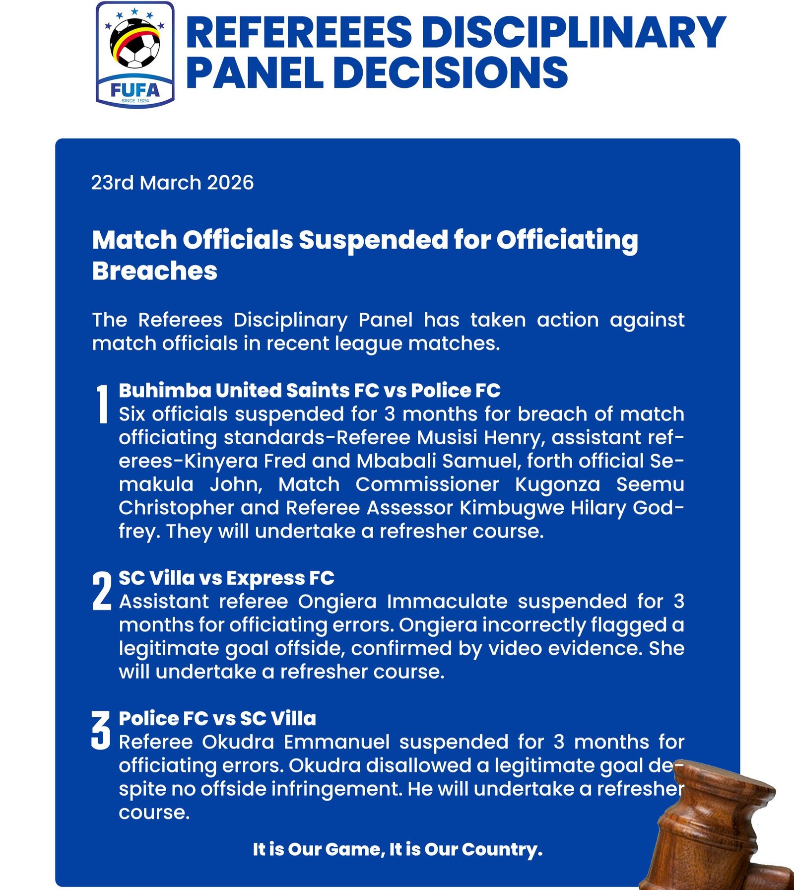 Baddifiri 6 abalamula omupiira wakati wa Buhimba United nga ettunka ne Police, bakaligiddwa ebbanga lya myezi 3, nga bano ye Musisi Henry, Kinyera Fred, Mbabali Samuel, Ssemakula John, Kugonza Ssemu Christopher ne Hillary Geoffrey Kimbugwe.