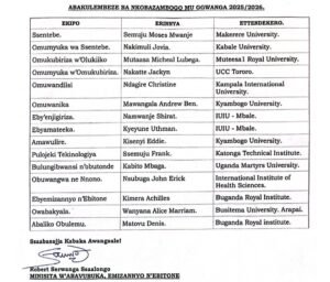Olukiiko olutongozeddwa;  Ssentebe ye Ssemujju Moses Mwanje okuva ku Makerere University, Omukubiriza ye Mutaasa Micheal  wa Muteesa the first Royal University, Owamawulire ye Kisenyi Eddy, Ndagire Christine muwandiisi, Kyeyune Uthman wa Mateeka, Nakimuli Jovia mumyuka wa Ssentebe, Nakate Jackline mumyuka wa mukubiriza, Wannyana Alice w’abakyala, Matovu Denis wa baliko obulemu Naabalala.