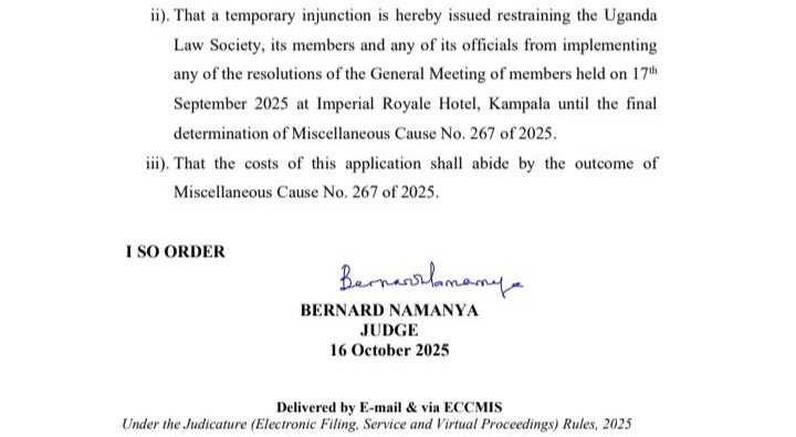 Kooti enkulu mu Kampala eyimirizza Ttabamiruka w’ekibiina ekigatta bannamateeka olwa Uganda Law Society (ULS) owa buli mwaka, abadde agenda okubaawo ku Saturday nga 18 October,2025 ku Imperial Resort Beach Hotel Entebbe.