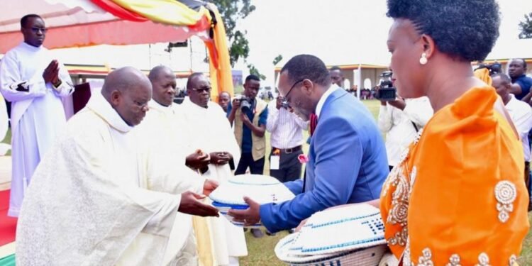 Omutaka Nsamba akwasizza Owek. Mathias Mpuuga effumu, omuggo n’engabo, n’amukubiriza okubeera n’omugongo  omuvumu n’okunywerera ku byabeera asazeewo, era abeere mutabaazi