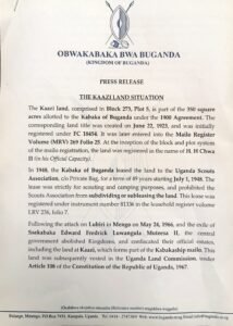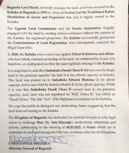 Obwakabaka bufulumizza ekiwandiiko ekinokoddeyo ebigambo byewandiika nga 04 March,2025 ebikwata ku ttaka ly’ e Kaazi, ebyalimu okutyoboola ensala ya kkooti, okunyomoola amateeka, n’okutyoboola Obwakabaka n’ekitongole kyabwo eky’ebyettaka, wamu ne kalebule gw’azze ayogera ku Buganda n’abakulembeze ab’enjawulo.