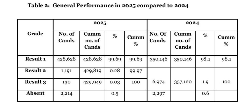 Ebibuuzo ebyakafulumizibwa ebyomutendera gwa S.4 nga byebyomulubdi ogwokubiri mu nkola eyebisomesebwa empya, biraze nti abayizi babiyise nnyo by’ebitundu 99.7%, era abayizi 130 bokka ku bayizi emitwalo 429,949 abaabituula bebaabigudde.
