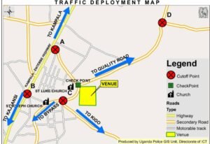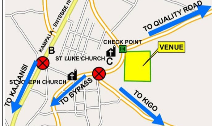 Mu enteekateeka eno police y’ebidduka agambye nti bonna abagenda okusunsulwamu bakozese oluguudo lwa Yusuf Lule, bagende e Mulago,Bwaise,bagwe ku luguddo lwa Northern Bypass okutuuka e Busega, awo balinnye ku Entebbe Express okutuuka ku ttaawo lye Kajjansi, bayite ku luguudo olwe Entebbe olukadde batuuke mu kifo akakiiko wekasunsuliramu e Lubowa.