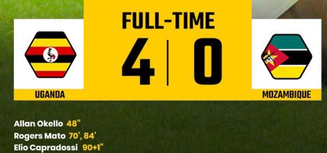 Goolo za Uganda Cranes zonna zitebeddwa mu kitindu eky’okubiri, nga ziteebeddwa Rogers Mato ateebyeko 2, Allan Okello ne Elio Capradossi.